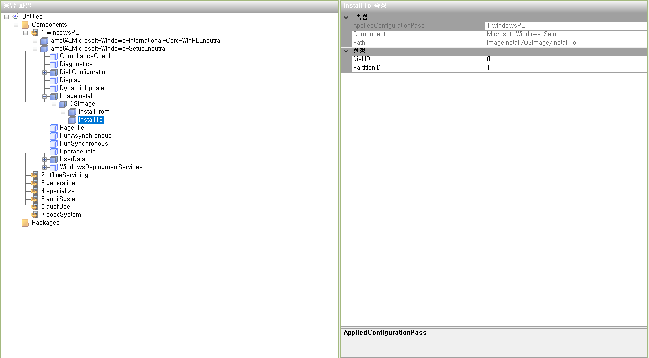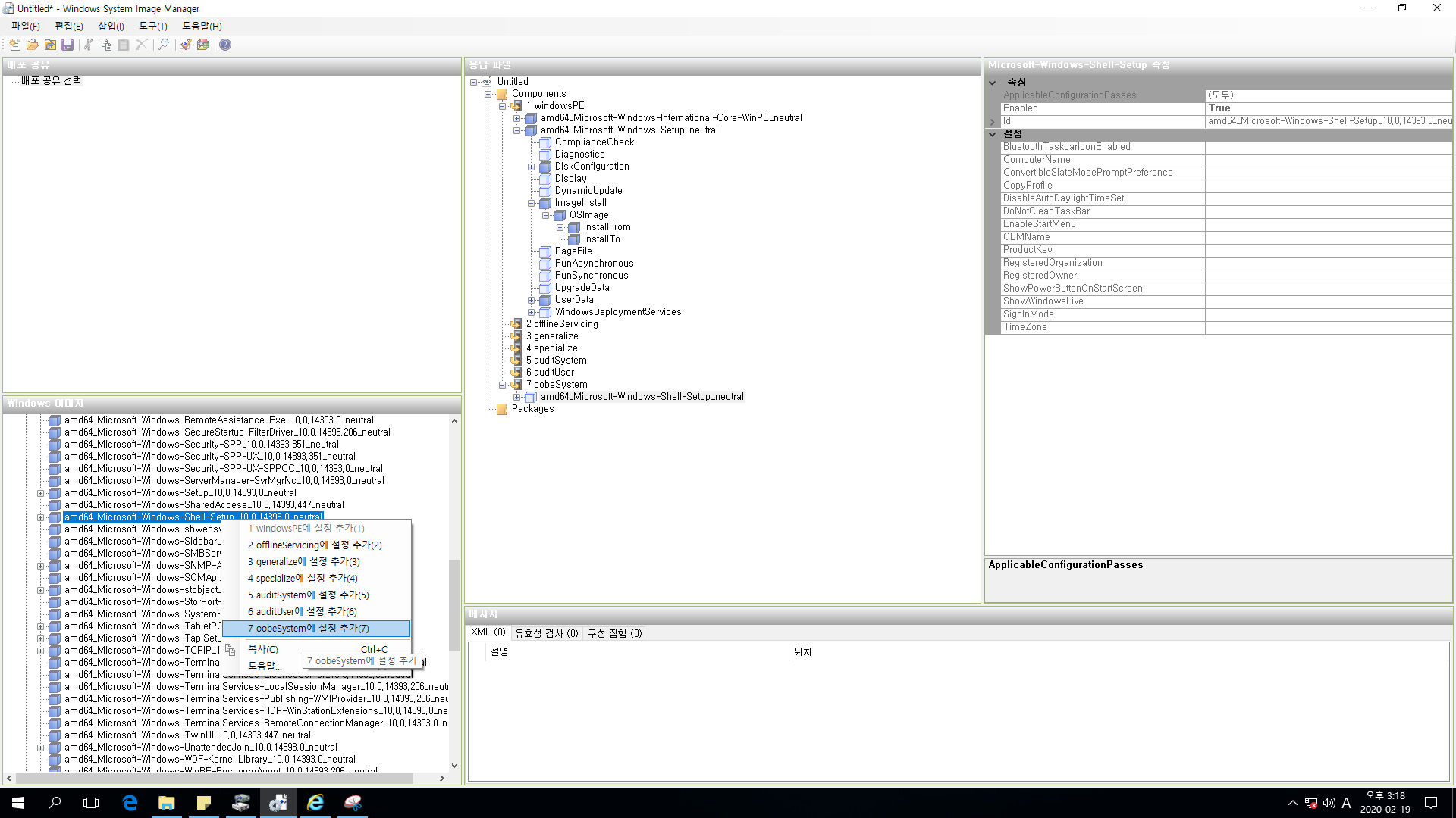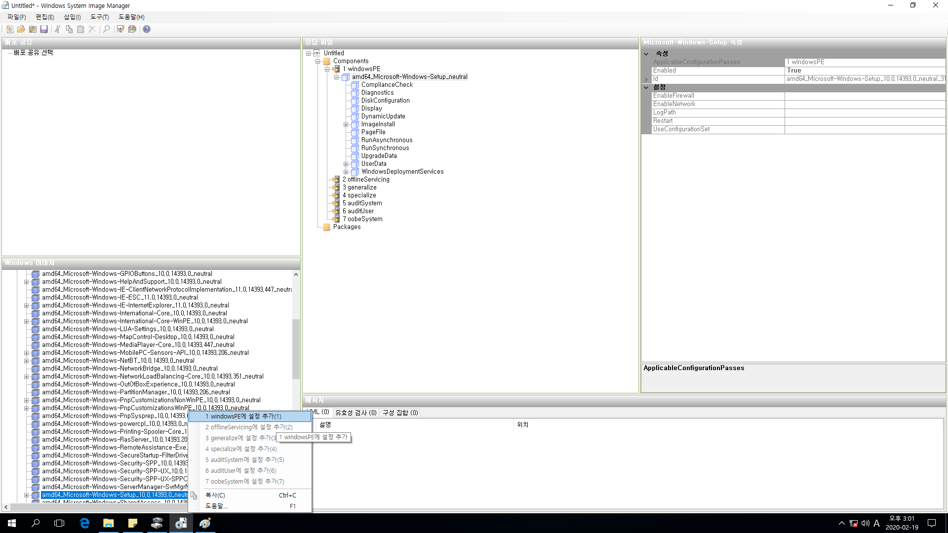 그림-7. 카테고리 추가 원하는 카테고리에 커서를 위치하고, 우측 버튼을 클릭하면 '1.windowsPE에 설정 추가'가 나오고 이어서 클릭하면 화면 중앙에 해당 카테고리가 추가되며 하위 항목들이 나열된다. 어떤 항목들에 대하여 어떤 값을 지정해야 하는지는 굉장히 많은 경우의 수가 있기 때문에 필요한 것들에 대해서만 구글링 하는 것을 권장한다.