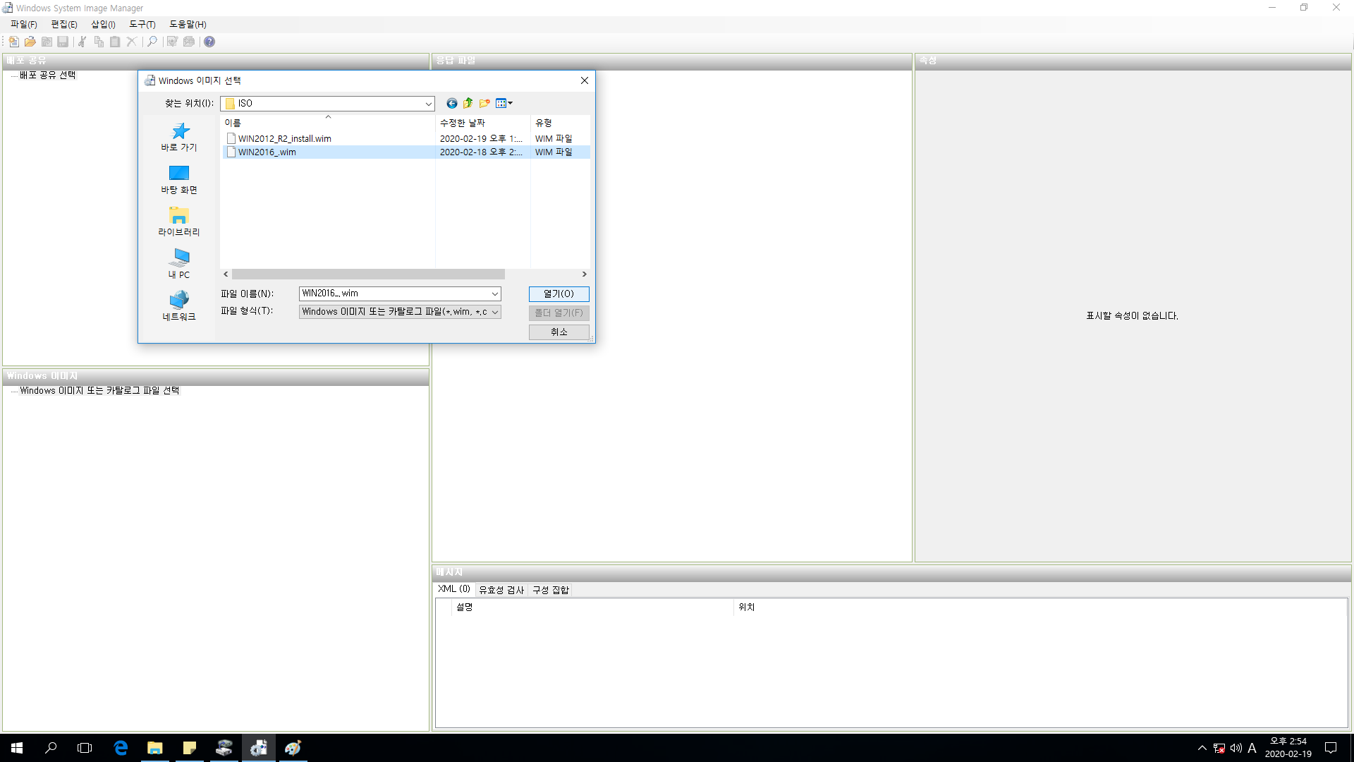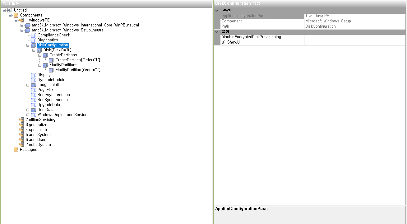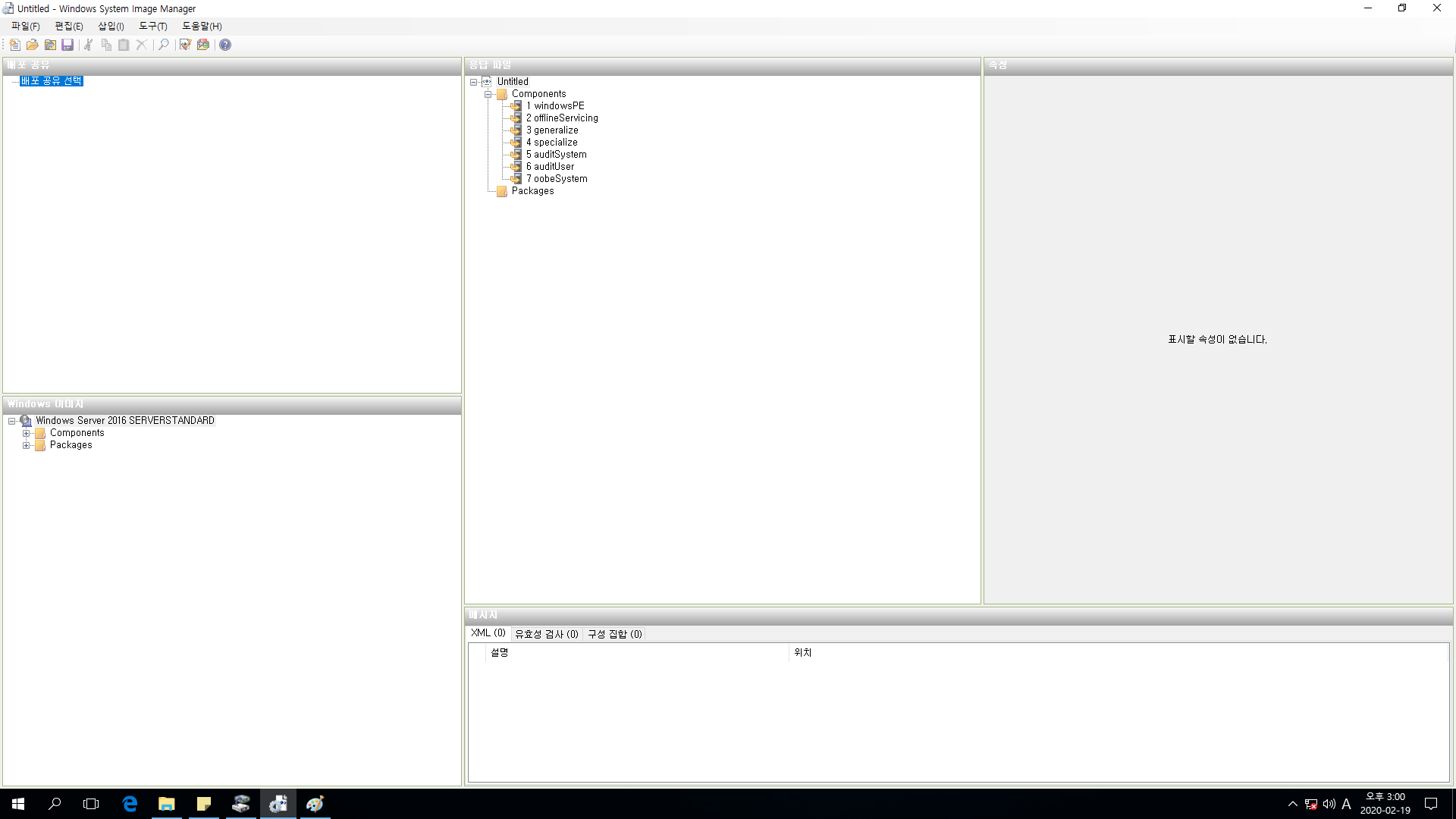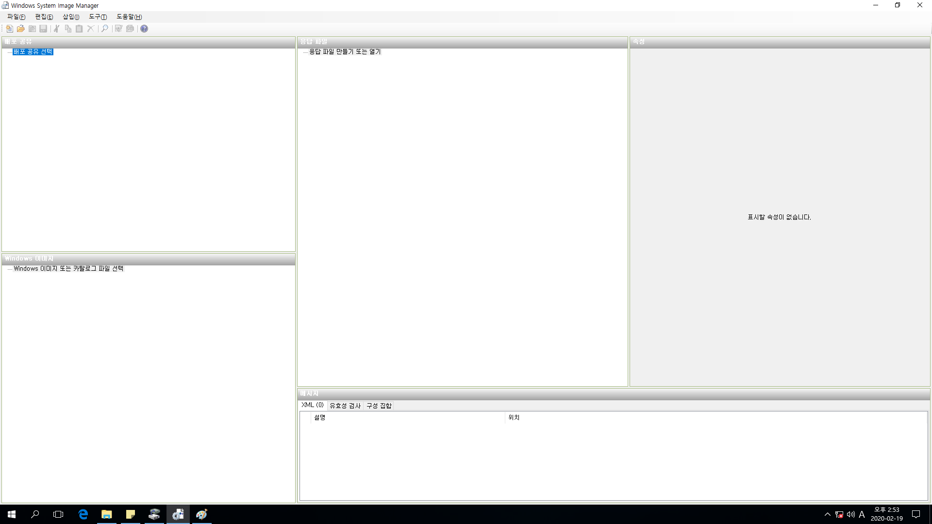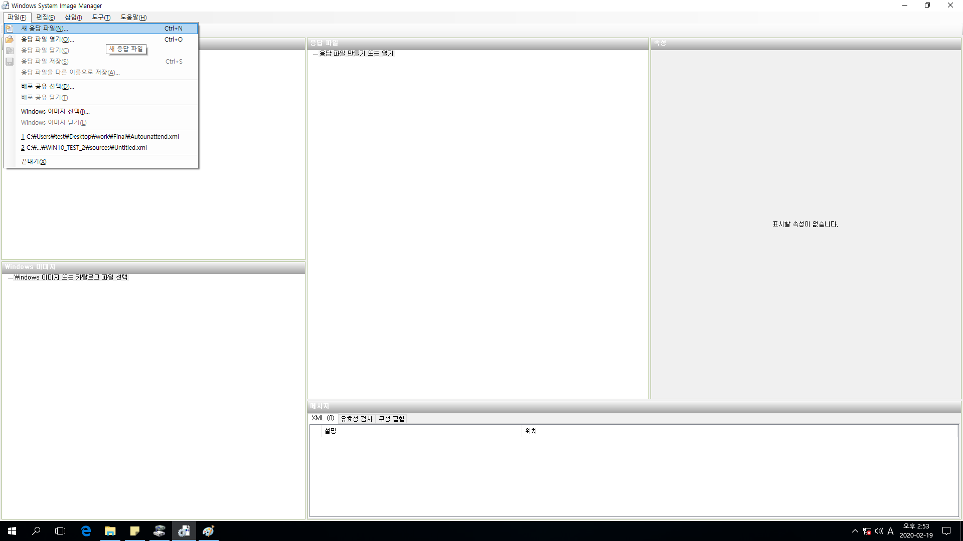 그림-2. 응답파일 생성(1) : 응답파일메뉴 열기 그림-3. 응답파일 생성(2) : 자동화할 WINDOW 이미지 파일 지정 그림-4. 응답파일 생성(3) 그림-5. 응답파일 생성(4) : 카탈로그 파일 생성 필요 시, 생성하고 진행하면 된다. 그림-6. 응답파일 생성(5) : 좌측 하단의 메뉴들이 추가되면 정상적으로 응답파일 생성을 위한 환경이 구성된 것이다. 여기까지 진행하면 이제부터는 응답파일을 작성할 수 있는 환경이 마련된 것이다. 이제부터는 본인이 원하는 옵션들을 반영하여 자동화를 구성하면 되는데, 필자는 총 6개 항목이 자동화되는 것으로 응답파일을 구성하였고 좌측 하단에서 큰 카테고리를 추가하고 세부 항목들에 대한 설정을 기입하는 방식으로 진행하면 되겠다.