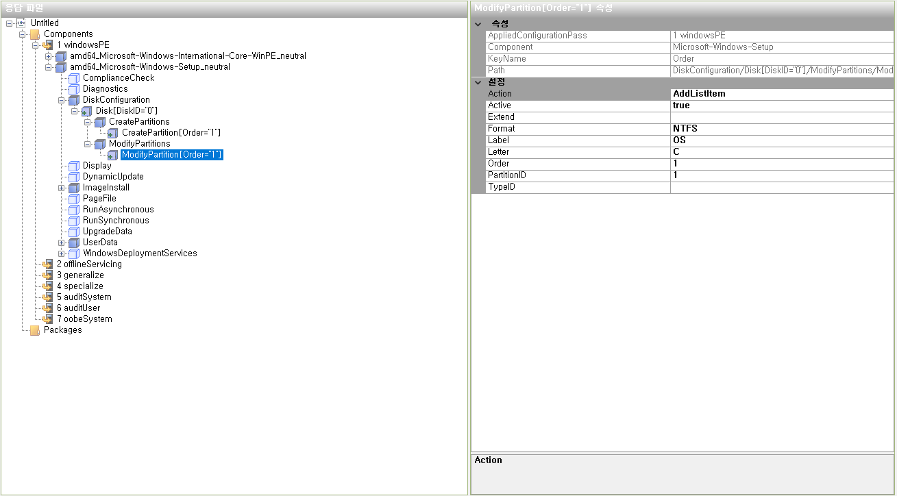 디스크 추가 → CreatePartition으로 기본 내용 추가 → ModifyPartition으로 세부 내용 추가 → 설치 파티션 지정